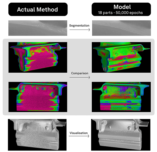 The Safran team imported CT scans into Hexagon’s VGSTUDIO MAX along with corresponding surface optical measurements to define the volume's surface. Safran then leveraged the deep learning capabilities of VGTRAINER by utilising 3D optical scans to train a sophisticated machine learning model within the software (Fig. 1). Deep learning enables the software to take a set of CT scans with a known surface and the deep segmentation model can be trained to the point it is able to predict for each voxel (a 3D pixel) of a CT scan whether it is representative of the surface or not, yielding a proper starting contour.