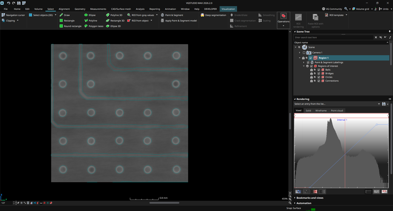 To train the deep neural network as precisely as possible, training data is required. This can be prepared in VGSTUDIO MAX. “First, we ‘cut’ a block from the dataset in which we manually perform the segmentation and labeling,” says Fuchs. The team then exports this data to VGTRAINER. “No machine learning expertise is required for this, and the most common parameters are already integrated into the software.” While training runs quickly with a small dataset, the expert recommends preparing multiple blocks to cover the various characteristics of a circuit board. “We focus on the sections where the evaluation shows the most errors during a test run,” Fuchs explains.