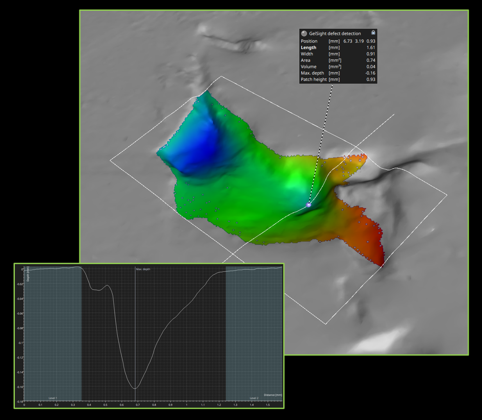 This feature allows you to visualize and report surface defects like scratches captured by a GelSight sensor and analyzed by GelSight Mobile software.