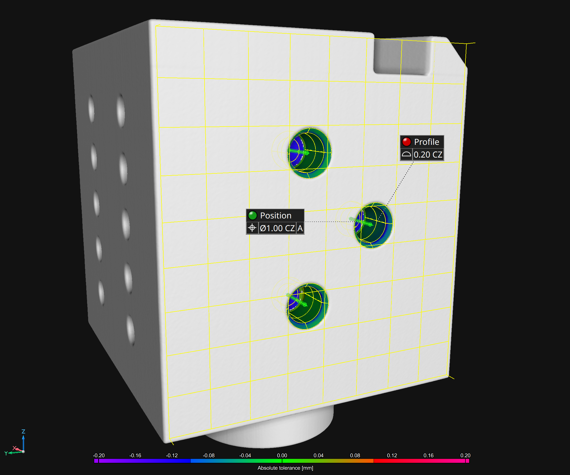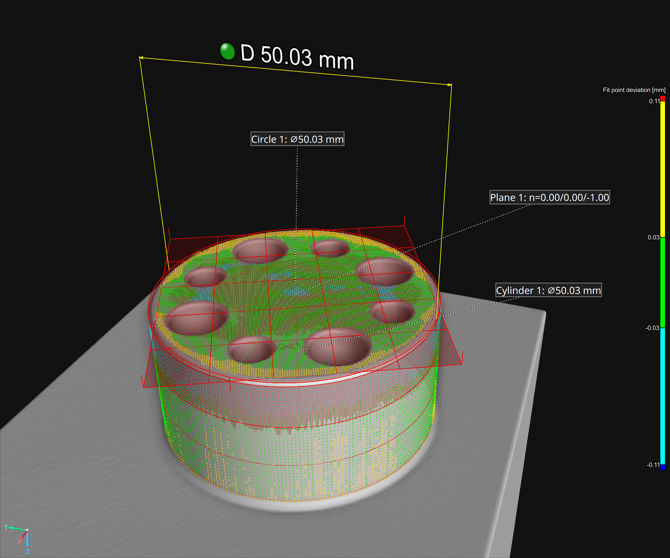 Instant tolerance status: Instantly view the tolerance status of each pore in an intuitive color-coded format. Simply select the tolerance status as "Active column" and identify the status visually using green (in-tolerance) and red (out-of-tolerance).