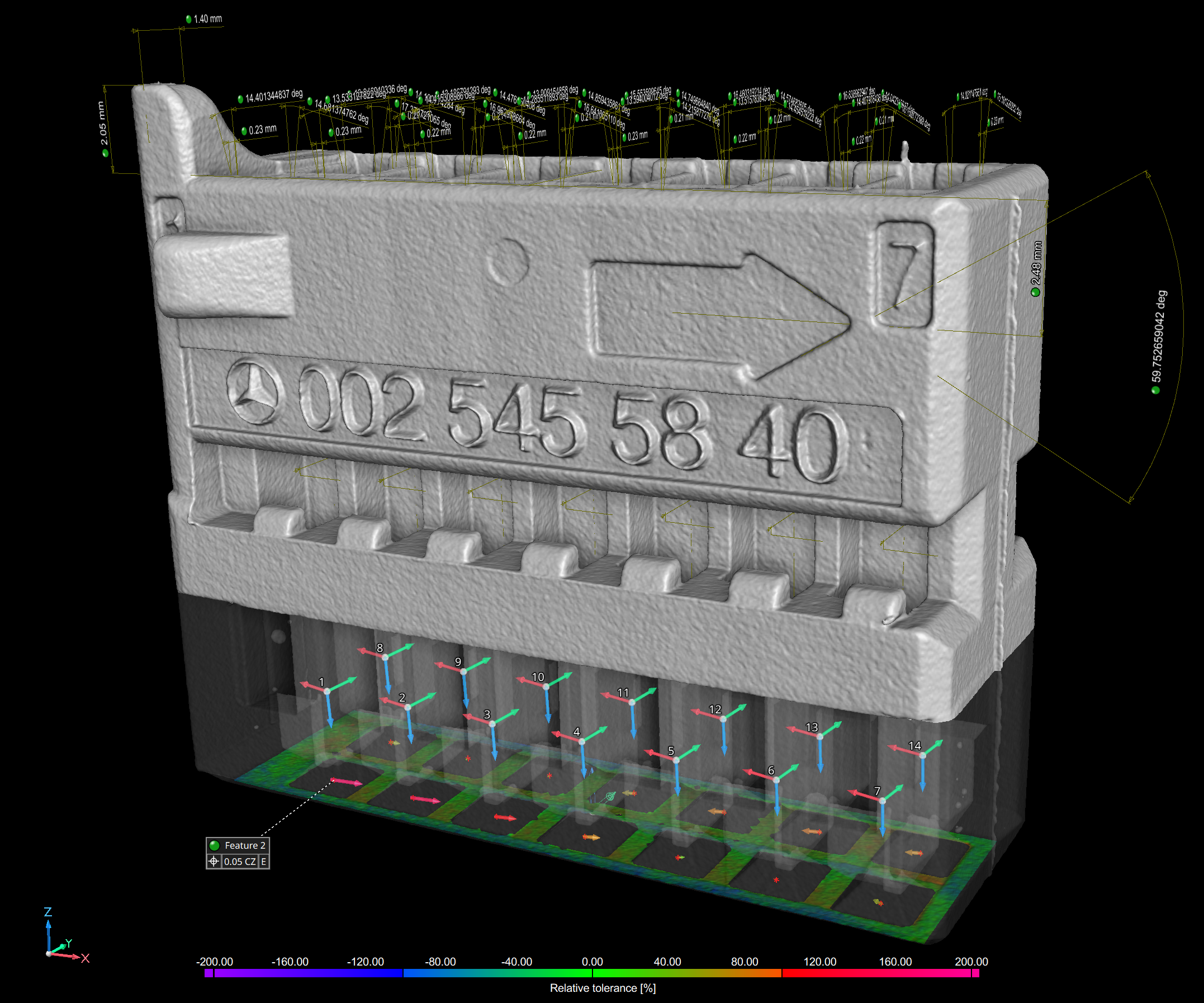 Our revamped OCR analysis significantly enhances the automatic text recognition capabilities of VGSTUDIO MAX and VGinLINE and comes with improved result customization options and reporting support. ASCII text on components will automatically be recognized and translated into the object's metainformation for use in inspection plans or reports.