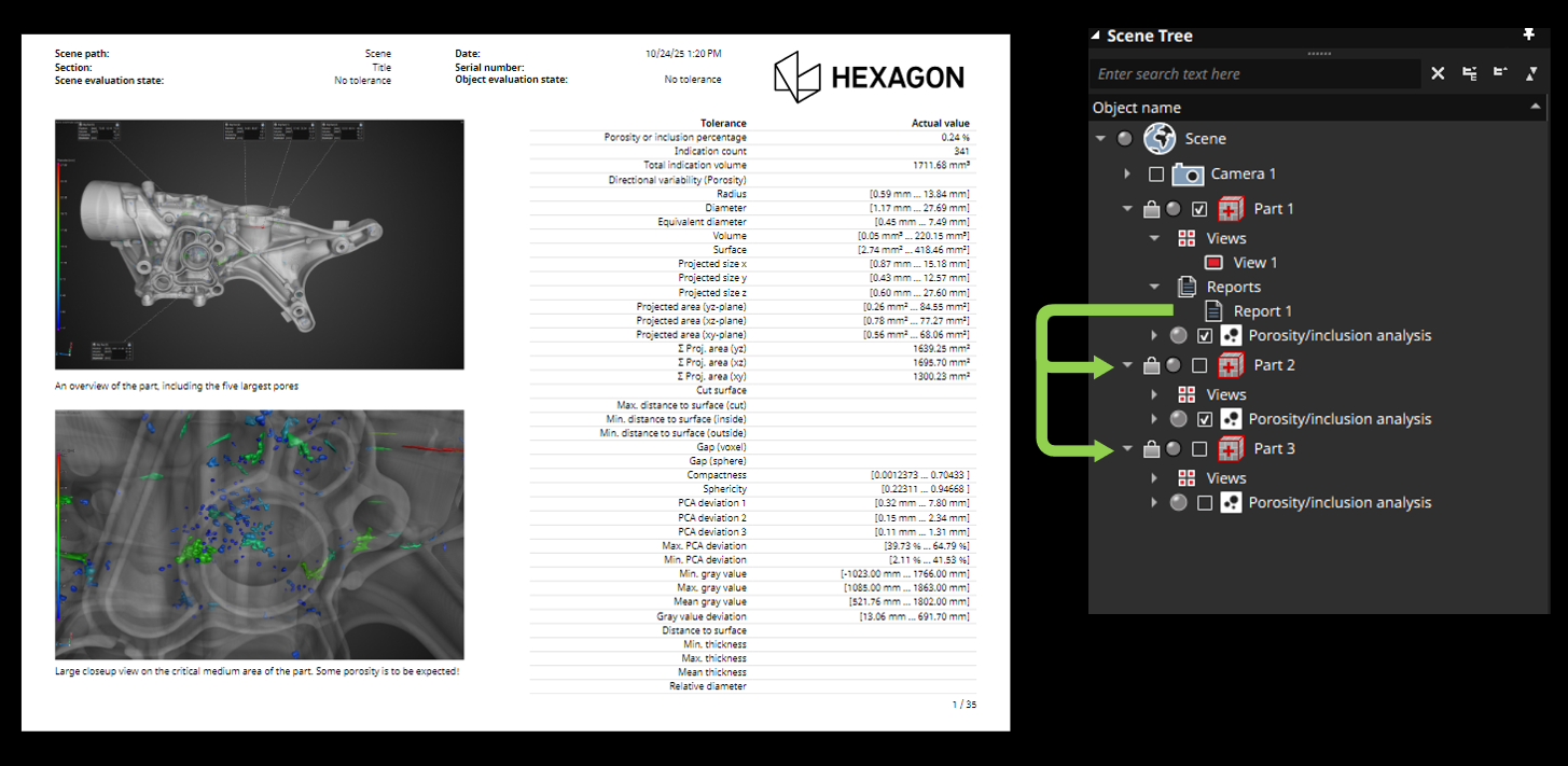You can easily distinguish between the two report types in the Scene Tree: a project report appears beneath the “Scene” entry, whereas a part report is listed under the corresponding object.