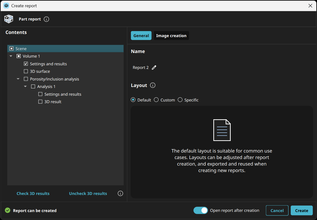 The updated reporting dialog uses the same modern, easy‑to‑navigate interface as the new porosity/inclusion analysis, and it automatically makes all your previously created custom report layouts available, so you can quickly reuse them without rebuilding anything from scratch.